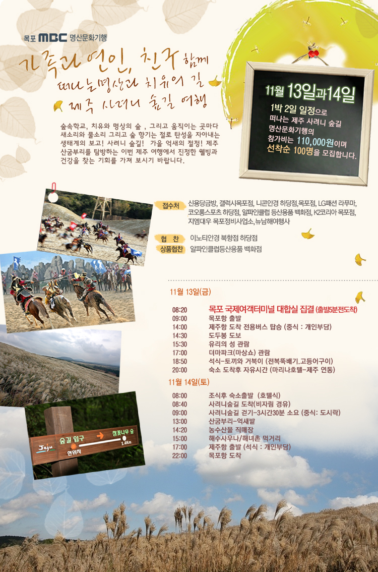 11월 13일과 14일 1박 2일 일정으로 떠나는 제주 사려니 숲길 명산문화기행의
