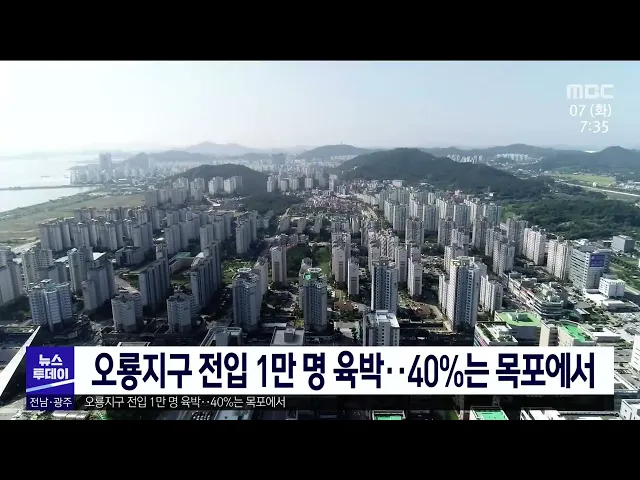 무안군 오룡지구의 전입인구가 1만 명에 육박하고 있습니다. 무안군 오룡지구에 들어선 호반써밋, 푸르지오, 한국아델리움 3개 단지는 평균 전입률이 96.8%에 이르며, 3천110세대, 9천7백61명이 전입한 것으로 나타났습니다. 오룡지구 전입인구의 42%는 목포에서 이동한 것으로 나타났습니다.