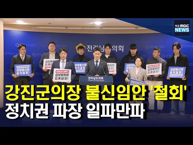 ◀ 앵 커 ▶ 전국 최연소 의장인 김보미 강진군의회 의장에 대한 '불신임 결의안'이 철회됐습니다. 총선을 앞둔 편가르기, 청년정치인 죽이기라는 비판이 거세지면서 한 발 물러선 것으로 보이지만 갈등의 불씨는 여전합니다. 김진선 기자가 보도합니다. ◀ 리포트 ▶ 김보미 강진군의회 의장에 대한 불신임 결의안이 상정...