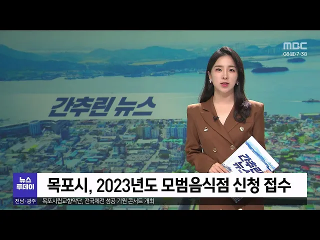 ◀ANC▶ 오늘의 간추린 뉴스입니다. 목포시는 음식문화개선에 앞장서는 일반음식점과 집단급식소를 대상으로 모범음식점 지정 신청을 받습니다. 지정 조건은 모범업소 세부 지정기준과 좋은식단 이행기준에 적합한 업소로서 서류심사와 현장실사 등을 거쳐 최종 지정됩니다. ------- 해남군은 올 연말까지 공공자금의 이자...