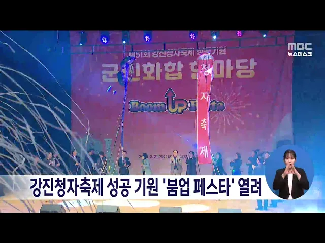 ◀ANC▶ 오늘의 간추린 뉴스입니다. 강진군이 제51회 강진청자축제를 앞두고 '군민 화합 한마당 붐업 페스타' 행사를 개최했습니다. 강진군은 이번 축제가 청자 제작에 필수요소인 '불'과 잘 어울리는 계절인 겨울축제로 새롭게 변신한 만큼 빛 조형물 전시와 LED 소원풍등 날리기, 불멍캠프 등 다채로운 행사를 마련했다...