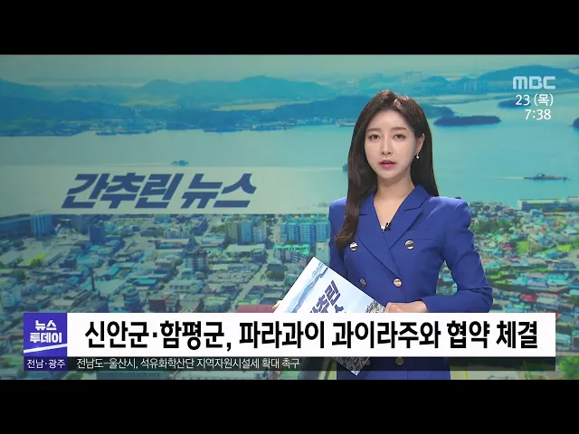 ◀ANC▶ 오늘의 간추린 뉴스입니다. 신안군과 함평군이 파라과이 과이라주와 잇따라 협약을 맺었습니다. 파라과이 과이라주 방문단은 신안군과 자매결연을 맺고 신안에서 생산되는 소금과 김 등 수산물 교역을 위한 협력에 나서기로 했습니다. 또 함평군과는 문화와 경제분야 협력을 위한 상호 우호 협약을 맺었습니다. --...
