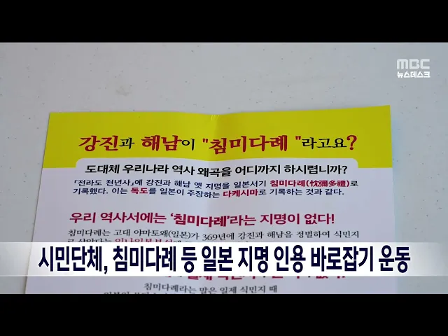 5백만 전라도민연대 등 시민단체들이 강진청자축제 현장에서 '전라도 천년사'의 잘못된 지명 바로잡기 서명운동을 펼쳤습니다. 민언련 등이 시민단체는 호남3개 광역지자체가 공동으로 추진한 '전라도 천년사'에 일본서기에 근거해 강진·해남지역을 '침미다례'로, 전북 남원을 '기문', 장수를 '반파'로 기술하고 있다고 반...