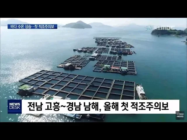 ◀ANC▶ 오늘 하루도 찜통더위가 이어졌는데요, 이처럼 폭염이 14일째 계속되면서 오늘(24) 고흥과 남해 일대 바다에 올해 첫 적조주의보가 발령됐습니다. 수온이 급격히 상승하면서 양식 어류의 폐사 피해가 우려되고 있습니다. 조희원 기자입니다. ◀END▶ 옥색 빛깔의 바다가 검푸른 색으로 변했습니다. 전남 고흥에서...