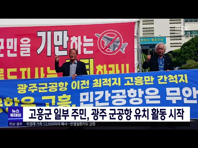함평에 이어 일부 고흥 주민들도 광주 군공항 유치 활동에 나섰습니다. 고흥지역 일부 주민들은 최근 전남도청과 무안군청을 잇따라 방문해 바다와 인접한 고흥이 소음 피해를 최소화할 수 있는 군공항 이전 최적지라며 광주 군공항은 고흥에, 민간공항은 무안에 이전하는 방안을 제안했습니다. 한편 함평지역발전연구원은 ...