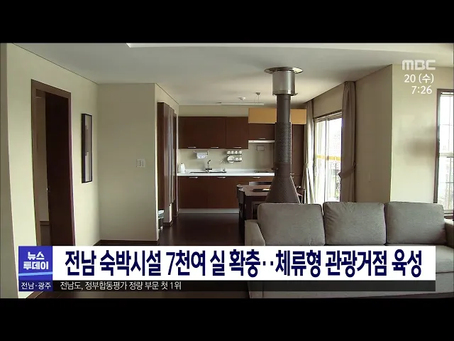 전라남도가 현재 1만6백여 실인 숙박시설을 2025년까지 1만 7천여 실로 늘리기로 했습니다. 전라남도는 풍광과 음식을 즐기며 체류하는 관광거점을 만들기 위해 신안 자은과 여수,고흥 등지에 호텔과 리조트 등 7천여 실을 조성 중이라고 밝혔습니다. 진도 대명리조트 솔비치가 운영된 뒤 진도지역 방문객은 연간 60만 명 ...