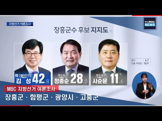 ◀ANC▶ 이번에는 장흥과 함평, 광양, 고흥지역 여론조사 결과입니다. 더불어민주당 후보와 무소속 후보들이 치열한 대결을 펼치고 있습니다. 김진선 기자가 보도합니다. ◀END▶ ◀VCR▶ 장흥군민들에게 차기 군수로 누구를 선택할 것인지 물었습니다. 더불어민주당 김성 후보 42.8% 무소속 정종순 후보 28% 무소속...