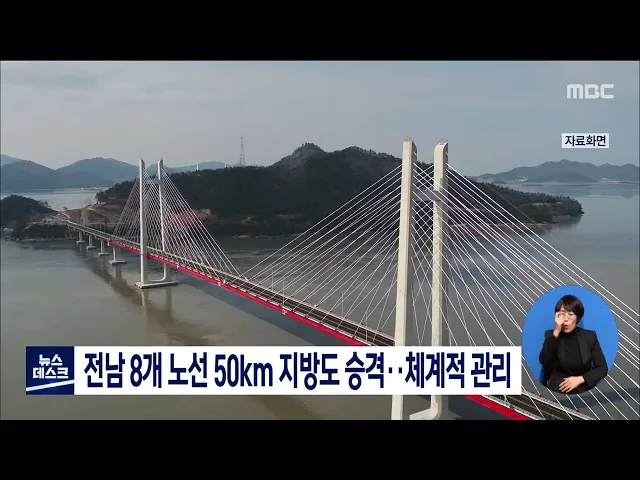 전남지역 주요 소재지와 섬을 연결하는 국도 등 기타 도로 8개 노선이 지방도로 승격됐습니다. 새로 승격된 도로는 완도 소안- 해남 땅끝, 진도 접도- 의신 , 완도 - 고흥, 진도- 영암 등 8개 노선 총연장 50점3킬로미터로 최근 국토부 승인에 이어 지방도 노선 변경 고시까지 마쳤습니다. 전라남도는 승격된 지방도 노선...