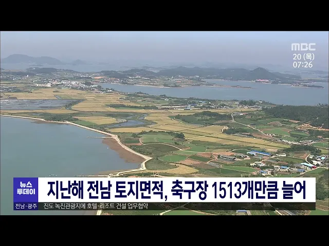 지난해 말 기준, 전남 토지면적은 1만 2천359㎢로 전년도보다 축구장의 1513배에 달하는 10.8㎢가 늘었습니다. 시군별 토지면적은 해남이 1천44㎢로 가장 넓고, 그 다음으로 순천, 고흥, 화순군 순이었습니다. 토지 면적이 가장 많이 늘어난 곳은 해남군 산이면으로 영산강 공유수면 매립지가 준공된데 따른 것입니다.