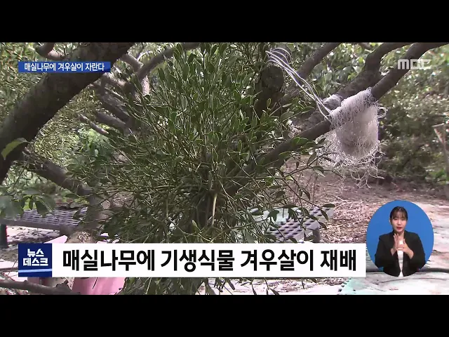 ◀ANC▶ 매실나무에 기생식물인 겨우살이를 심어 수확하는 방법이 보급을 앞두고 있습니다. 겨우살이는 약용으로 가치가 높아 매실 농가의 새로운 소득원으로 자리 잡을지 관심입니다. 유민호 기자가 취재했습니다. ◀VCR▶ 광양의 한 매실농장입니다. 열매를 거둬들인 매실나무마다 초록색 둥지 모양의 식물이 자라 있습...
