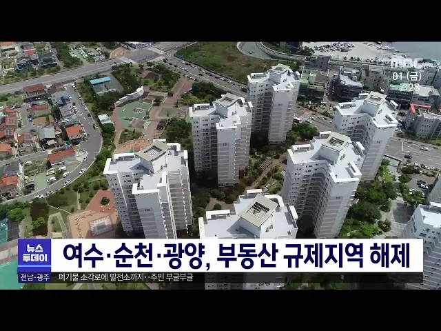 여수시와 순천시, 광양시가 정부의 부동산 규제 조정대상지역에서 모두 해제됐습니다. 국토교통부는 오늘, 새 정부 첫 주거정책심의위원회를 열고 6개 지역의 투기과열지구 해제와 함께, 여수시와 순천시, 광양시 등, 전국 11개 지역의 조정대상지역 해제를 결정했습니다. 국토부는 이들 지역이 주택가격 상승폭이 비교적 ...