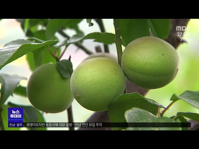 ◀ANC▶ 국내 최대 매실 주산지인 광양 지역에서도 매실 생산이 본격적으로 시작됐습니다. 올해도 역시 이상 기후 때문에 매실 작황이 평년 수준을 밑돌 것으로 보입니다. 김주희 기자가 보도합니다. ◀END▶ ◀VCR▶ 초록 빛깔의 매실이 탐스럽게 영글었습니다. 광양지역 1350여 ha면적에서 매실 생산이 본격적으로 시...