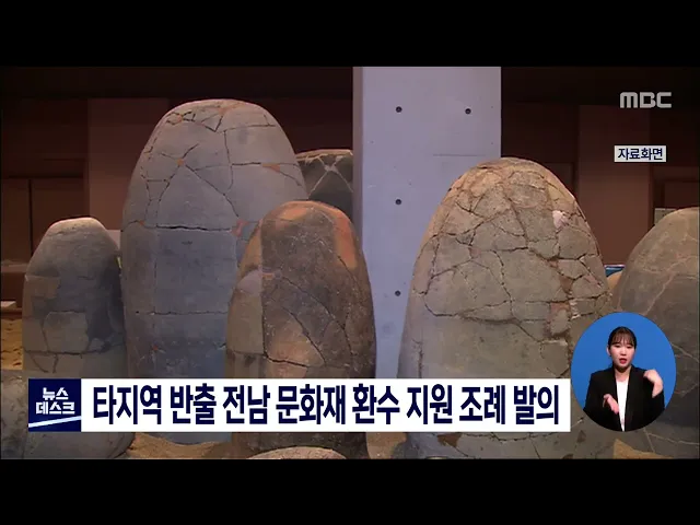 전국 최초로 타 지역으로 반출된 전남 문화재 환수를 지원하는 조례가 발의됐습니다. 전라남도 문화재 환수 활동 지원 조례안은 불법으로 반출되거나 유출된 전남 문화재 환수 활동 추진을 위한 지원 계획 수립과 실태 조사, 재정 지원 등의 내용을 담고 있습니다. 영암 도갑사 묘법연화경과 광양 증흥산성 쌍사자석등 등 ...