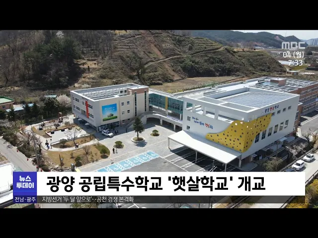 ◀ANC▶ 지역 특수 교육의 새로운 요람이 될 광양 햇살학교가 개교했습니다. 특히, 광양 햇살학교는 지역민들이 먼저 편견없이 받아들이고 보듬어 안아 이뤄낸 결실이어서 그 의미가 더욱 깊습니다. 김주희 기자가 취재했습니다. ◀END▶ ◀VCR▶ 광양시 옥룡면의 공립특수학교 햇살학교가 새롭게 문을 열었습니다. 지난...