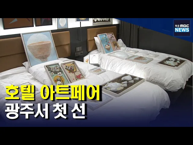 ◀ 앵 커 ▶미술시장에서는 수 년 전부터 호텔아트페어가 새로운 트렌드로 떠올랐는데요.미술의 도시 광주에서 뒤늦게 첫 선을 보이고 있습니다.조현성 기자가 보도합니다. ◀ 리포트 ▶새하얀 침대보 위로 크고작은 작품들이 빼곡히 놓여있습니다.책상과 소파는 물론 객실 입구의 복도 바닥까지 차지한 미술품들.호텔 방이라는...
