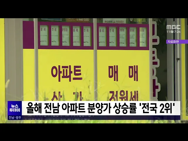 올해 아파트 분양가 상승률이 16년 만에 최고를 기록한 가운데전남지역 아파트 분양가도 전국에서 두 번째로 높은 상승세를 보였습니다. 부동산 정보제공 업체인 부동산R114 통계를 보면지난 7일까지 전남지역 아파트 분양가는 3.3㎡당평균 1,405만 원으로지난해보다 24% 올랐습니다.같은 기간 광주의 아파트 분양가는 2,13...