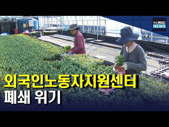 ◀ 앵 커 ▶외국인 노동자들의 정착과 일자리 등을 도와주는 지원센터가 있는데 내년에 폐쇄될 위기에 처해 있습니다.정부가 내년도 예산을 전액삭감했기 때문인데여러가지 부작용이 우려됩니다.천홍희 기자가 취재했습니다.◀ 리포트 ▶광주의 한 꽃재배 농장입니다.여기서 일하는 캄보디아 노동자의 어려움을 듣기 위해 캄보...