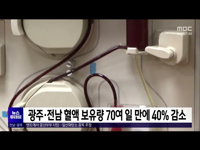 광주·전남지역 혈액 보유량이 가파르게 줄어들고 있습니다.대한적십자사 광주·전남혈액원에 따르면 지난 20일 기준, 적혈구제제의 보유량은 6.1일분으로 혈액형별로는 O형 4.0일분, A형 4.1일분, B형 11.2일분, AB형 6.5일분 입니다.지난 8월 1일 적혈구제제 10일분을 확보하고 있던 것에 비해 70여 일 만에 40% 가까이 줄...