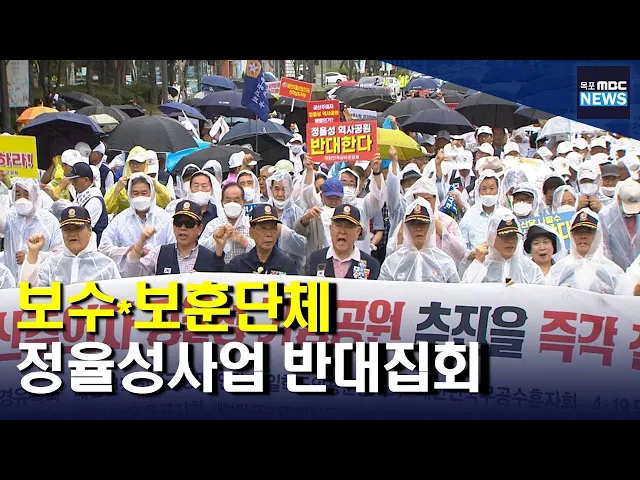 (앵커) 정율성 공원 사업을 반대하는 보수단체와 보훈단체들이 오늘(30) 광주시청에서 대규모 집회를 열었습니다. 광주시는 한중우호사업인 정율성 사업을 책임지고 잘 진행하겠다는 입장을 내놨습니다. 임지은 기자가 보도합니다. (기자) 비가 오는 궂은 날씨에도 보훈단체 회원들이 광주 시청 앞을 가득 메웠습니다. 정율...
