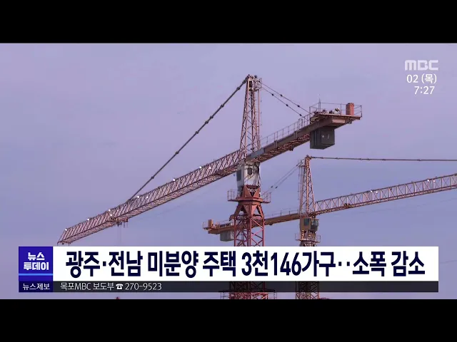 광주·전남 지역 미분양 주택 물량이 최근 줄어든 것으로 나타났습니다. 국토교통부 주택 통계를 보면, 지난 1월 말 기준 광주의 미분양 주택 물량은 262가구로 전달보다 29가구, 10% 줄었고 전남은 같은 기간 2천884가구로 145가구, 4.8% 감소했습니다. 전남의 경우 악성 미분양으로 꼽히는 준공 후 미분양 주택도, 25가구,...