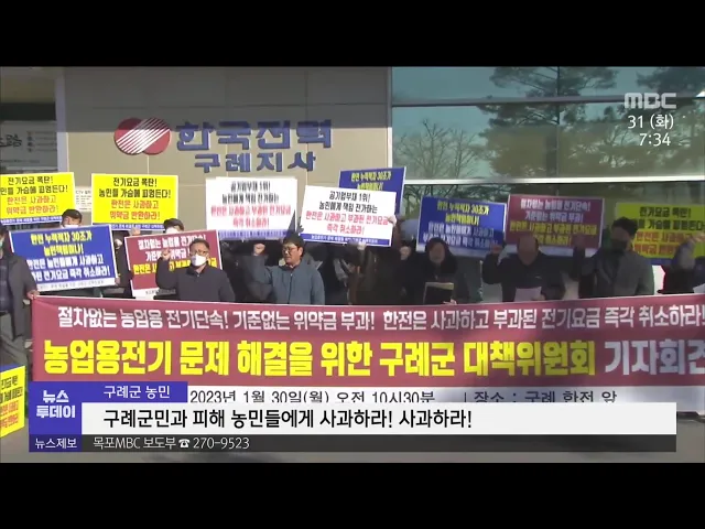 (앵커) 한국전력의 농사용 전기 단속에 반발한 농민들이 한전을 항의 방문했습니다. 농민들은 단속도 기준이 없었을 뿐만 아니라 위약금을 부과하는 과정도 납득하지 못하겠다며 격렬하게 항의했습니다. 임지은 기자가 취재했습니다. (기자) (녹취) "구례군민과 피해 농민들에게 사과하라! 사과하라!" 한국전력의 농사용 전...