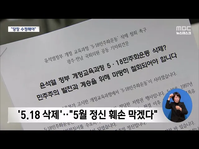 (앵커) 5.18민주화운동이 빠진 현 정부의 '개정 교육 과정'에 대한 정치권과 지역사회의 반발이 확산하고 있습니다 5.18이 삭제되면 국민의 고통이 끝나지 않고, 국민들이 또다시 분열할 것이라며 당장 수정돼야 한다고 목소리를 높였습니다. 한신구 기자의 보도 (기자) "민주주의 근간을 뒤흔들고 자랑스런 민주주의의 역...