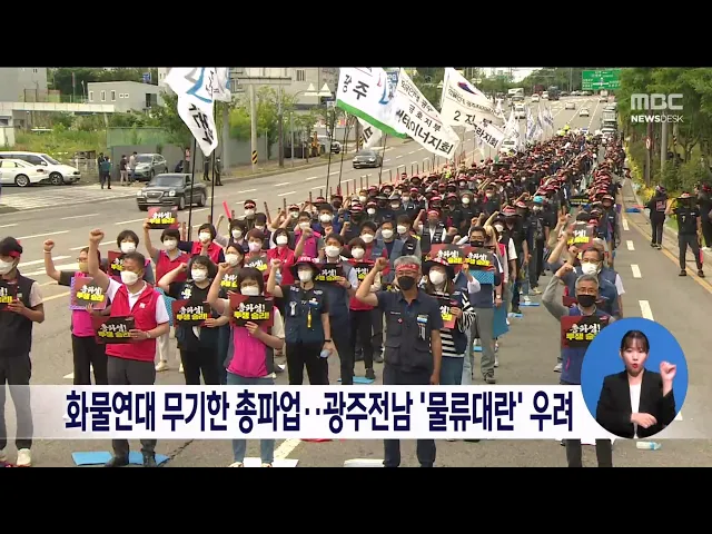 ◀ANC▶ 화물연대 광주와 전남지역본부가 총파업에 들어가면서 물류차질 우려가 커지고 있습니다. 화물연대 노동자들은 과로와 과속에 내몰리지 않게, 적정 운송료를 보장하는 안전운임제를 영구적으로 도입하고, 품목도 늘려줄 것을 요구하고 있습니다. 유민호 기자가 취재했습니다. ◀VCR▶ 화물차가 도로 위에 줄지어 ...