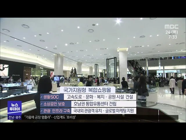 (앵커) 복합 쇼핑몰 건설을 위해 유통 대기업들이 앞다퉈 광주시장 진출을 준비하고 있습니다. 대선 공약에 반영될 만큼 시민들의 관심이 높은 상황에서 정부가 어느 정도 규모로 지원 대책을 내놓을 지 주목받고 있습니다. 김영창 기자의 보돕니다. (기자) 대선공약에서 지방선거까지 이어진 광주 복합쇼핑몰 건설 사업. ...
