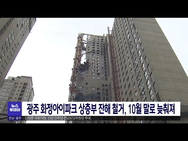 광주 화정동 아이파크 사고현장의 상층부 잔해 철거 마무리 작업이 10월말까지 늦춰집니다. 광주 서구에 따르면 아이파크 201동 26층에서 38층 사이의 벽체와 기둥, 잔해를 모두 철거하는 작업이, 먼지가 덜 발생하는 공법으로 바뀌면서 당초 예정보다 한 달 반 정도가 지연될 것으로 예상되고 있습니다. 현대산업개발은 20...