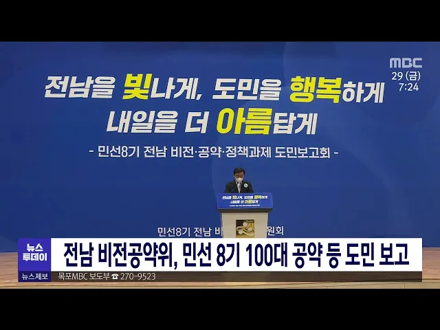 전남 비전 공약위원회가 도민보고회를 열고 민선 8기 전라남도 정책방향과 100대 공약, 60대 정책과제 실행방안 등을 발표했습니다. 주요 공약과 정책과제는 반도체 산업 전남 광주 공동 육성과 첨단 전략산업 30조 원 투자 유치, 친환경 재생에너지 산업벨트 조성 등입니다. 전라남도는 공약사항 실천계획서를 세워 도민 ...