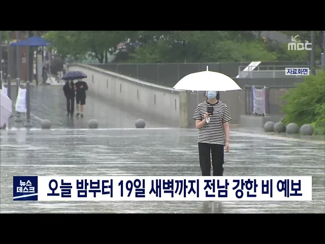 오늘(17) 밤부터 오는 19일 새벽까지 전남에 강한 비가 예보됐습니다. 광주지방기상청에 따르면 오늘(17) 밤부터 서해안에 비가 시작돼 19일 새벽까지 30에서 100밀리미터의 비가 내리겠고, 특히 남해안지역 예상 강우량은 최대 150밀리미터 이상으로 예상됩니다. 또 내일(18) 새벽부터 순간풍속 시속 55킬로미터 안팎의 강...