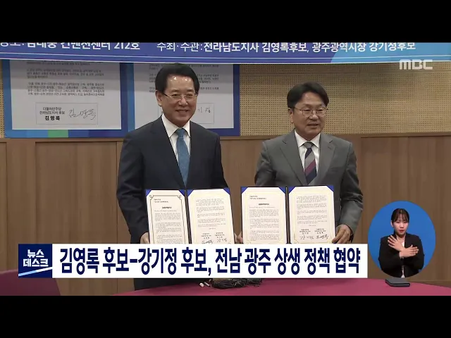 민주당 김영록 전남지사 후보와 민주당 강기정 광주시장 후보가 광주전남 상생정책협약을 맺었습니다. 두 후보는 이를 위해 전남 광주 상생특별위원회를 후보 직속으로 설치하고 당선되면 공식 기구로 발족해 상생발전 협의를 이어 나가기로 했습니다. 이번에 협약한 상생안건은 반도체 등 첨단미래산업 공동 유치와 교통...