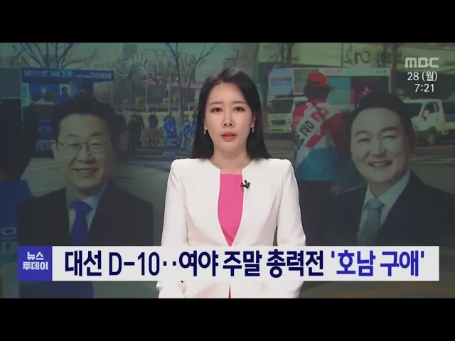 (앵커) 대선이 이제 10일 가량 남은 가운데 이번 주말 광주전남 곳곳에서 호남 표심에 지지를 호소하는 여야 유세전이 진행됐습니다. 특히 이번주는 대선 승부의 바로미터가 될 사전 투표를 앞두고 있어 대선 승기를 잡기 위한 총력전이 펼쳐졌습니다. 송정근 기자입니다. (기자) 대선을 10여일 앞둔 주말. 광주 시내 곳곳...