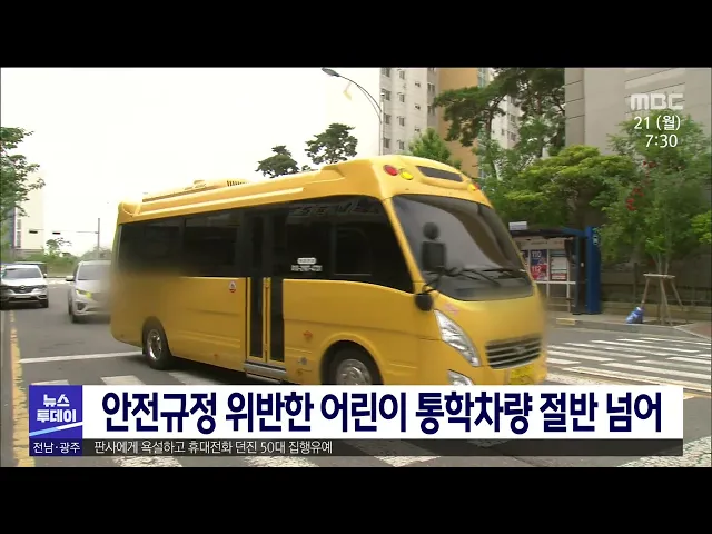 광주·전남지역 어린이 통학버스 가운데 절반이 넘는 차량이 안전규정을 어겨 시정조치를 받았습니다. 한국교통안전공단 광주전남본부는 광주 전남의 어린이 통학버스 762대에 대해 지난해 2차례 안전점검을 실시했으며 차량 62%에서 위법사항을 적발했습니다. 특히 '보호표지 설치상태 위반' 사례가 190여건으로 집계돼 가...