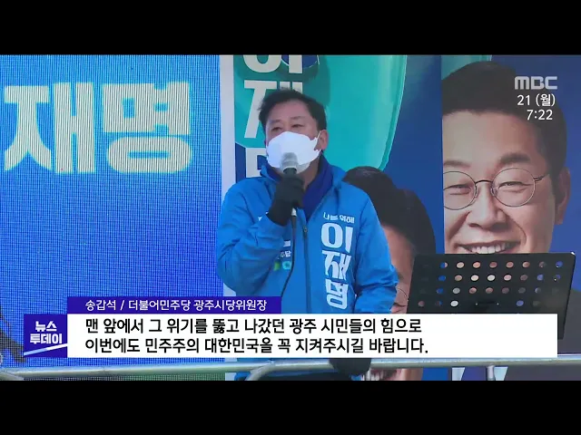 ◀ANC▶ 이재명 더불어민주당 대선 후보가 공식 선거운동 시작 이후 첫 호남 유세로 목포와 순천, 나주, 광주를 잇따라 찾았습니다. 이재명 후보는 군사 독재로 고생했는데 이제 검찰 왕국에서 고생해야하겠냐며 자신이 "DJ가 꿈꾼 세상 만들겠다"고 호남 표심에 호소했습니다. 김 윤 기자입니다. ◀END▶ ◀VCR▶ 순천...