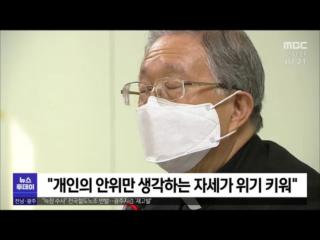 (앵커)천주교 광주대교구 김희중 대주교가성탄메시지를 발표했습니다.오늘날과 같은 위기는개인의 안위만 생각하는 자세에서 비롯됐다며광주 정신 중에 하나인 대동정신으로위기를 극복하자고 강조했습니다.송정근 기자입니다.(기자)천주교 광주대교구 김희중 대주교는코로나19가 확산하고 있는 현재의 상황을인간의 이기심...