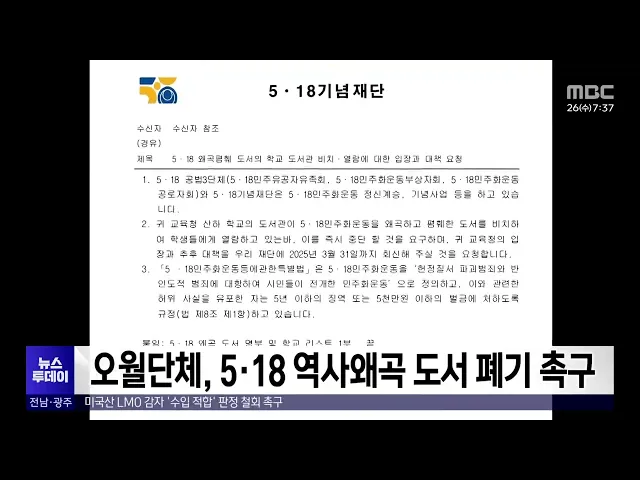 전국 초중고교에 5.18 왜곡도서가 400권 가까이 있다는 광주 교육단체의 성명과 관련해 5.18 단체들도 도서 폐기를 촉구하고 나섰습니다.5.18 기념재단과 5.18 공법 3단체는전국 17개 교육청에 공문을 보내초중고교 도서관에 있는 5.18 왜곡 도서의 폐기를 촉구했습니다.재단은 시민 제보와 모니터링으로 5.18 왜곡 도서를 ...