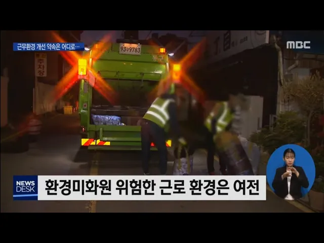 (앵커) 광주에서 환경미화원들이 작업 중 사고로 잇따라 목숨을 잃고 난 뒤에 정부는 근무환경 개선을 약속했습니다. 하지만 약속은 흐지부지됐고, 근무 환경도 크게 달라지지 않았습니다. 우종훈 기자가 현장취재했습니다. (기자) 새벽에 후진하는 청소차에 끼여 숨진 환경 미화원 .. 대낮에 청소차 짐칸에 몸이 끼어 숨진...