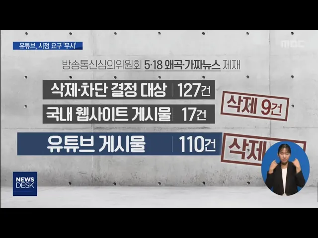 (앵커) 5.18 가짜뉴스가 유튜브에서 사라지지 않는 데는 다 이유가 있었습니다. 정부가 삭제와 차단을 요구해도 외국에 서버를 둔 업체들이 이를 무시하고 있습니다. 특히 구글이 소유한 유튜브는 시정요구를 단 한건도 이행하지 않은 것으로 드러났습니다. 우종훈 기자가 취재했습니다. (기자) 극우논객 지만원씨가 운영하...
