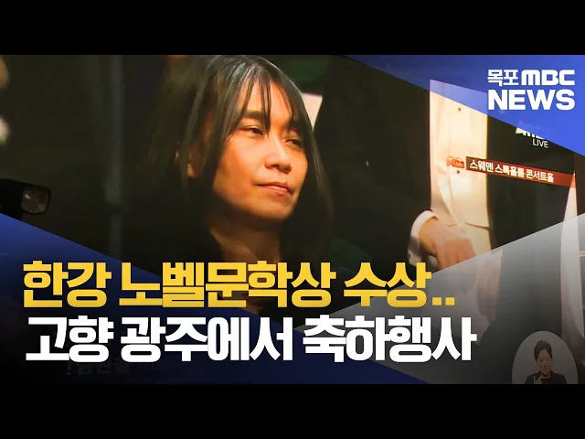 ◀ 앵 커 ▶한강은 '노벨문학상의 의미를 폭력에 맞서는 사람들과 나누고 싶다'고 말했습니다.잔혹한 국가폭력에도 당당하게 맞섰던 광주는 그런 한 작가에게 깊은 감사와 지지를 보냈습니다.주현정기자입니다.◀ 리포트 ▶◀ SYNC ▶엘렌 마트손/노벨문학상 심사위원"디어(dear, 친애하는) 한강."스웨덴 스톡홀름 콘서트장에 마...