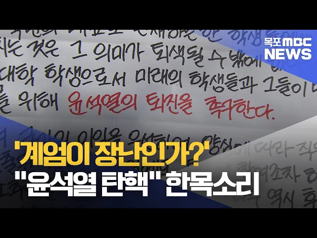 ◀ 앵 커 ▶윤석열 대통령은 시종일관야당을 범죄자 집단으로 취급하고, 국민을 향해 총구를 겨누고도 버젓이 내란을 부정하는 등 황당한 변명으로 일관하고 있습니다.하루 빨리 탄핵시켜야한다는 규탄의 목소리는 점점 더 거세지고 있습니다.김단비 기자입니다.◀ 리포트 ▶흰 종이 위에 꾹꾹 눌러쓴 글자에분노와 탄식이 담겼...