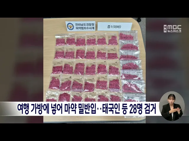 마약류를 국내에 밀반입해판매·투약한 일당이 경찰에 붙잡혔습니다.전남경찰청 마약범죄수사계는 불법체류중인 외국인들이 마약을 유통하고있다는 첩보를 바탕으로 지난 7월 광주에서 마약 거래 현장을 적발한 뒤 상선을 추적해 야바 2만 정을 밀반입한 20대 태국인 등 28명을 검거했습니다.이들은 마약류를 말린 생선과 개...