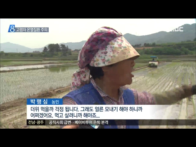 (앵커) 때 이른 폭염이 이어지면서 온열 질환에 노출될 위험 또한 커지고 있습니다 특히 고령자들이 걱정입니다. 송정근 기자입니다. (기자) 뜨거운 태양이 작렬하는 정오. 메말라 버린 논에 농부가 물을 댑니다. 타는 듯한 더위에도 가뭄 때문에 늦어져 버린 모내기를 하기 위해 구슬땀을 흘립니다. (인터뷰)김효식/농민 "...