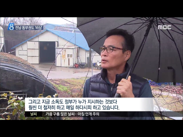 ◀ANC▶ 고병원성 AI가 전국적으로 확산추세를 보이면서 전남동부지역도 비상이 걸렸습니다. 현재까지 이상징후는 발견되지 않고 있지만 인근 구례 오리농장에서 AI 양성이 확인되자 긴장감은 점차 높아지고 있습니다. 김종태 기자가 취재했습니다. ◀END▶ 비가 오는 궂은 날씨속에서도 양계 농가에 소독 작업이 한창입...