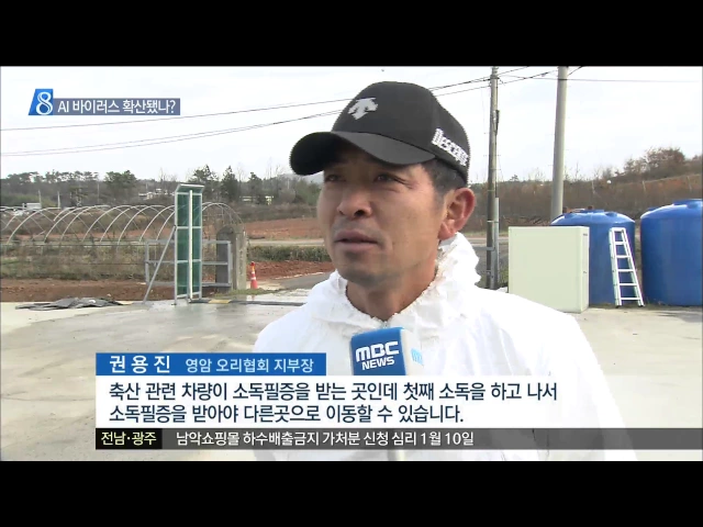 영암에서도 조류인플루엔자가 발생한 것으로 확인됐습니다. 전라남도는 지난 22일 나주 반남면의 조류인플루엔자 발생 농가에서 3킬로미터 안에 들어있는 영암군 시종면 월롱리 오리 농가에서도 고병원성 조류인플루엔자 확진판정이 나왔다고 밝혔습니다. 이 농가에 대해서는 나주 농가와 함께 이미 예방적 매몰처분이 끝...