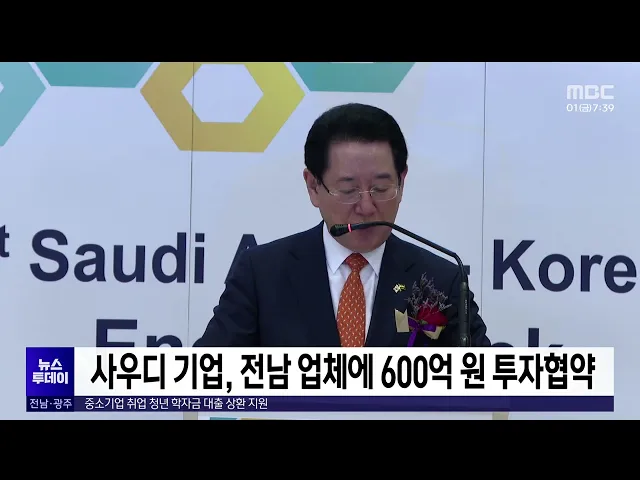 사우디아라비아 기업이 전남의 중소기업에 6백억 원의 투자 협약을체결했습니다. 전라남도는 지난해 사우디아라비아에서 진행한에너지위크 행사를 통해 사우디 대기업 알 코라예프 그룹이 전남의 태양열집열기 전문 기업에 600백억 원의 투자를 하기로 협의 했으며 오는 4월 나주에서 최종 수출 계약이 체결될 예정이라고...