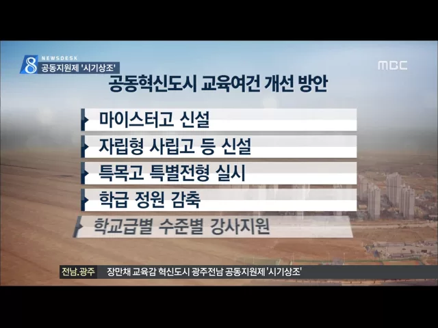 장만채 전라남도교육감이 나주 혁신도시의 고교 공동지원제 도입에 대해 부정적인 입장을 나타냈습니다. 장 교육감은 오늘 신년기자회견을 열고 나주시에서 고교 공동지원제 도입을 해 달라는 공문이 왔지만 고교 공동지원제를 지금 실시하면 광주로 학생들이 빠지고 부모들이 혁신도시에 살지 않아 시기적으로 적절하지 않...