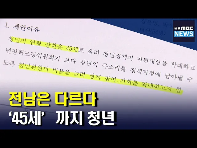 ◀ANC▶ 전남에서는 45세까지 '청년'으로 공식 인정을 받게 됐습니다. 청년 기본 조례에서 규정하는 청년의 연령을 39세에서 45세로 확대한 건데요. 전국에서 처음입니다. 김진선 기자가 보도합니다. ◀END▶ ◀VCR▶ 전남의 평균 연령은 48세, 전국 17개 시도 가운데 가장 높습니다. 시 지역 평균 연령은 44.6세, 군 지...
