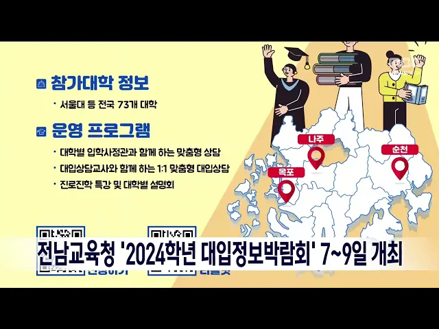 전라남도교육청이 오는 7일 목포실내체육관을 시작으로 나주와 순천에서 '2024학년도 대입 정보 박람회'를 잇따라 개최합니다. 전국 74개 대학이 참여하는 이번 박람회장에서는 입학사정관들과 대면 상담을 할 수 있으며 사전 신청자 통해 1대1 수시 상담도 받을 수 있습니다.