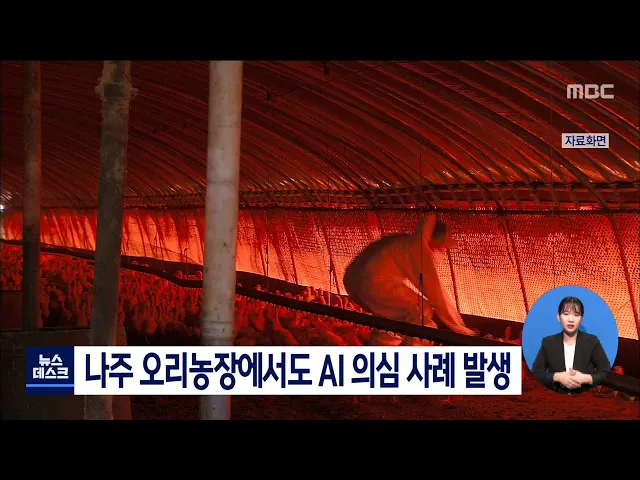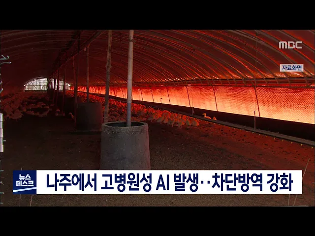 나주의 오리농장에서 발생한 AI가 고병원성으로 확진됐습니다. 전라남도는 나주시 세지면의 한 육용오리 농장이 고병원성 조류인플루엔자 최종 확진 판정을 받았다고 밝히고, 같은 계열사 농장에 대한 일제 점검에 들어갔습니다. 이번 고병원성 AI 확진은 올들어 전국에서 5번째, 전남에서 2번째 사례로 전남에서는 지난 1...
